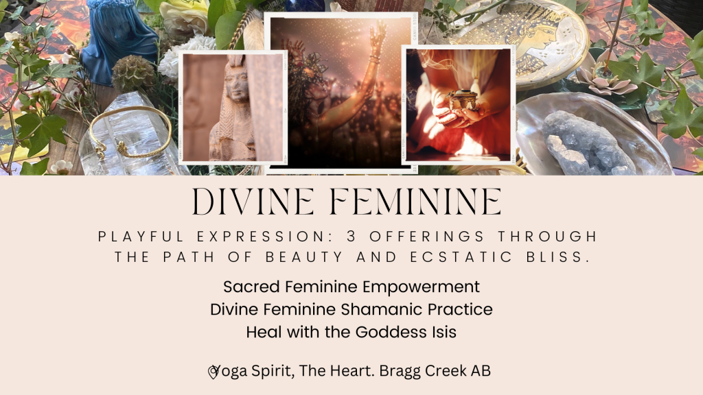 Join me in Bragg Creek through the Divine Feminine Playful Expression, The Path of Beauty and Ecstatic Bliss. This is a beautiful offering for your heart and life path to help you with spiritual nourishment, empowerment, trust, sacred knowledge and the creative space that derives within your heart.